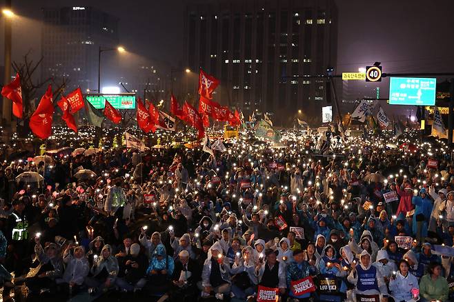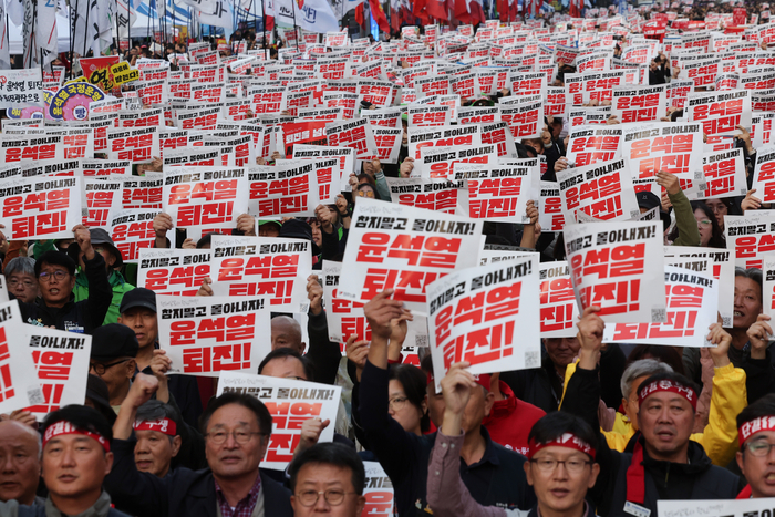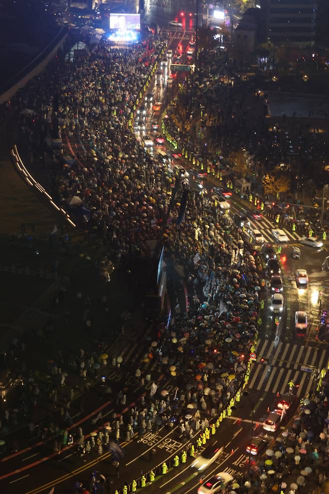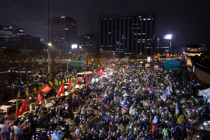 2024년 11월 16일, 서울 광화문 일대에서는 윤석열 대통령의 퇴진을 요구하는 대규모 집회가 열렸습니다. 비가 내리는 궂은 날씨에도 불구하고 많은 시민들이 모여 "윤석열 퇴진"을 외치며 정부에 대한 불만을 표출했습니다.