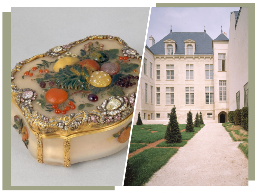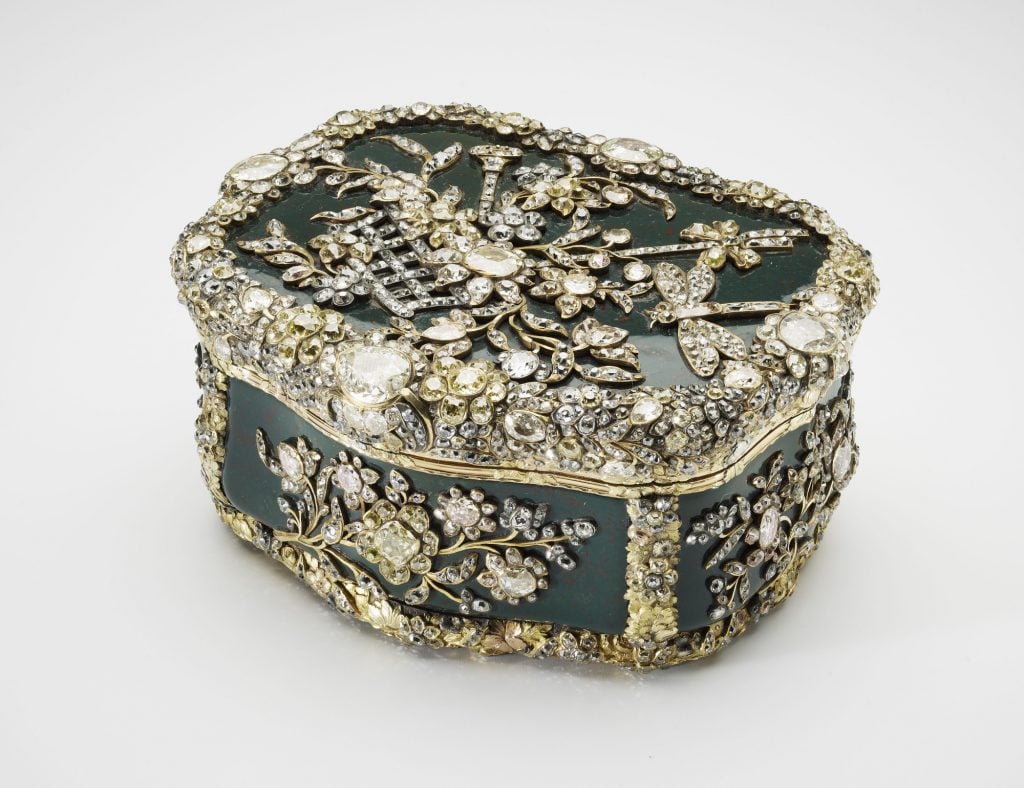 한 예로, 프러시아의 프레데릭 3세를 위해 1770년대 베를린에서 제작된 코담배갑은 녹색 재스퍼 케이스에 금으로 테두리를 두르고, 약 3천 개의 다이아몬드로 장식되어 있습니다. 또 다른 유물은 1740년경에 제작된 것으로, 비너스의 탄생을 묘사한 이미지가 금과 청금석 밴드 안에 새겨져 있습니다.
